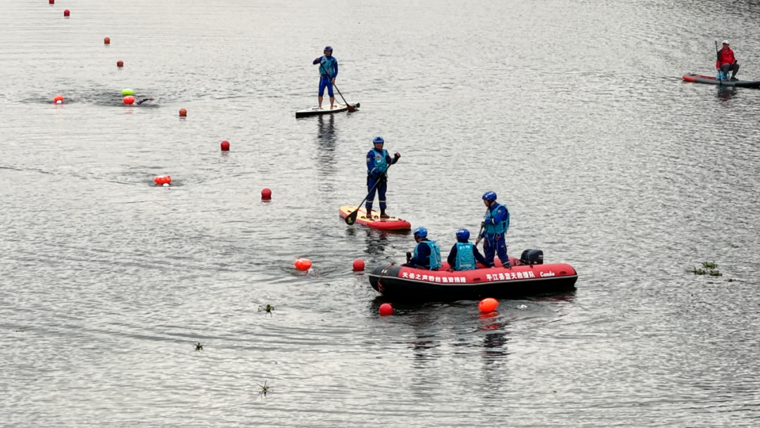 在選手們劈波斬浪的同時,江面上,還有一群藍天救援隊隊員立于艇上,目光如炬,緊盯著每一位劈波前行的泳者,筑起一道移動的安全防線。