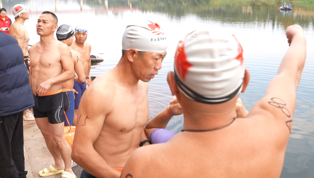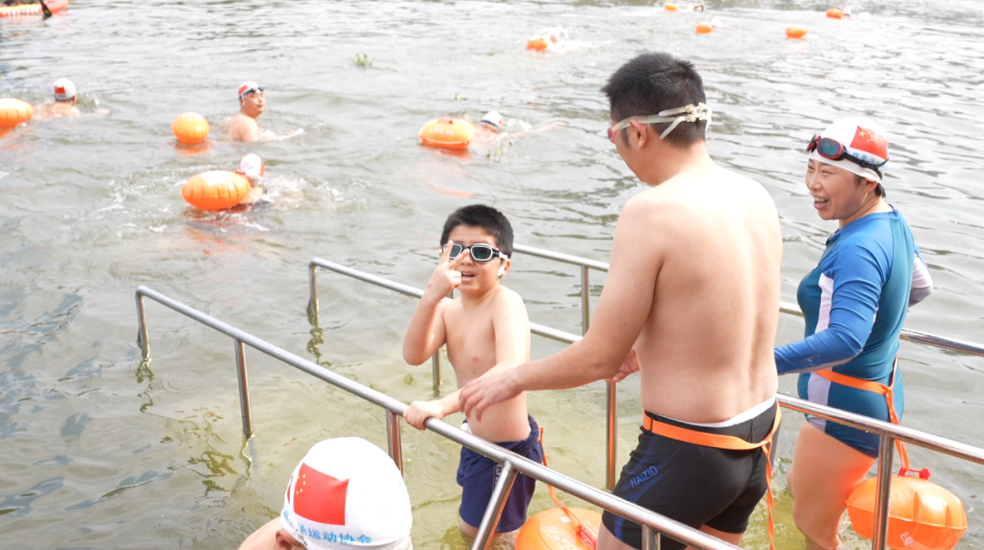 不遠處,10歲的盧弘揚正有模有樣地擺動雙臂做熱身。父親在一旁鼓勁道:“能下水,今天就是成功了。”在爸爸的貼身守護下,這位年紀最小的選手勇敢地完成了挑戰,上岸時興奮地對著鏡頭比出勝利的“V”字。