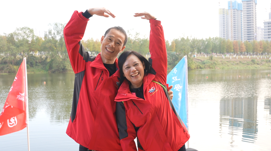 53歲的周輝紅與丈夫在江邊雙手比心,甜蜜記錄他們的“冬泳約會”。